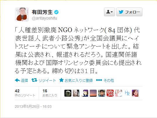 ▼有田芳生議員がHPに掲載したヘイトスピーチに関するアンケートは武者小路公秀氏=主体(チュチェ)思想国際研究所理事